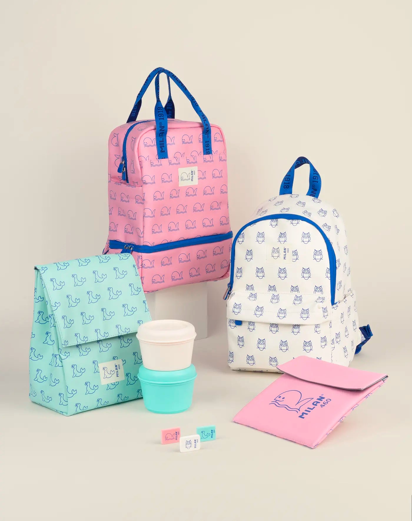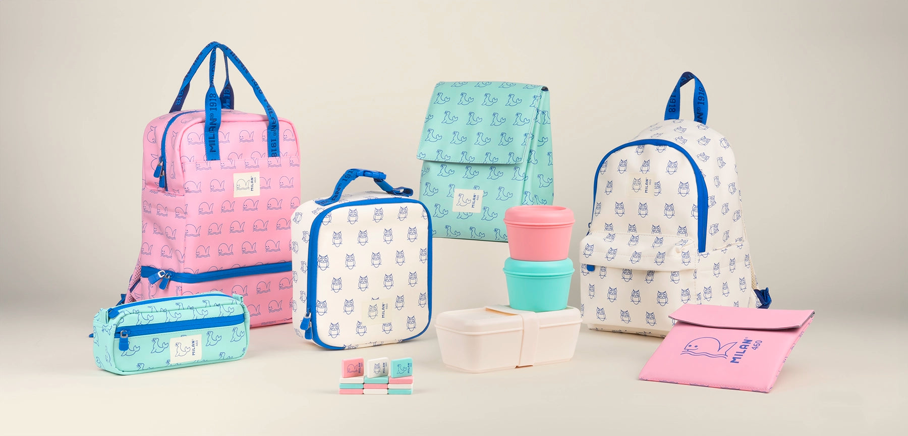 Motxilles infantils, estoigs escolars i bosses porta aliments ideals per als més petits. Teixit de poliuretà, d'alta qualitat i tacte suau, estampat amb foques, mussols i balenes sobre els colors de la goma 460. Inspirada en els colors i disseny originals de les gomes d'esborrar MILAN, de fabricació nacional des de 1918.