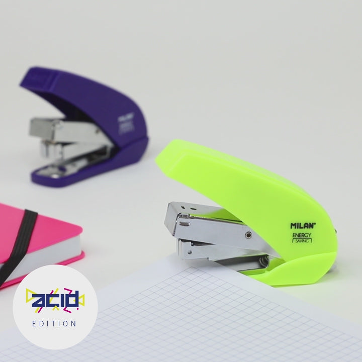 Grapadora compacta desmultiplicadora de força (30% menys d'esforç al grapar). Amb cos de plàstic, col·lecció Acid. Botó de pressió que facilita la recàrrega de grapes, visor de grapes i peça metàl·lica desgrapadora la part posterior. Inclou capseta amb 1000 grapes.